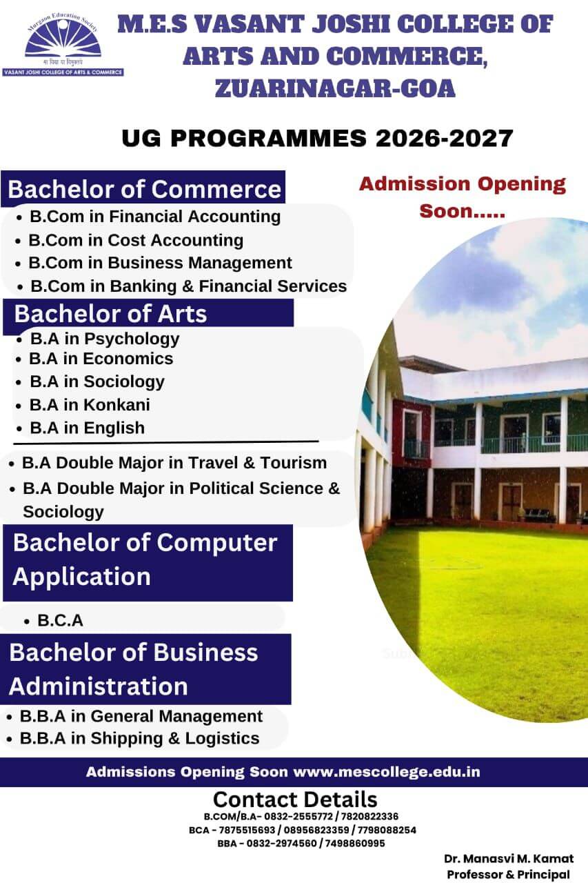 MES College warmly invites you to closely associate with us and be a part of journey towards higher academic enterprise, value sensitisation and nation building. With the blessings of the presiding deity of Vasco City, Lord Damodar, the benevolence of the Joshi family and support of our Management the ‘MES Team’ is well-equipped to deliver its Best.